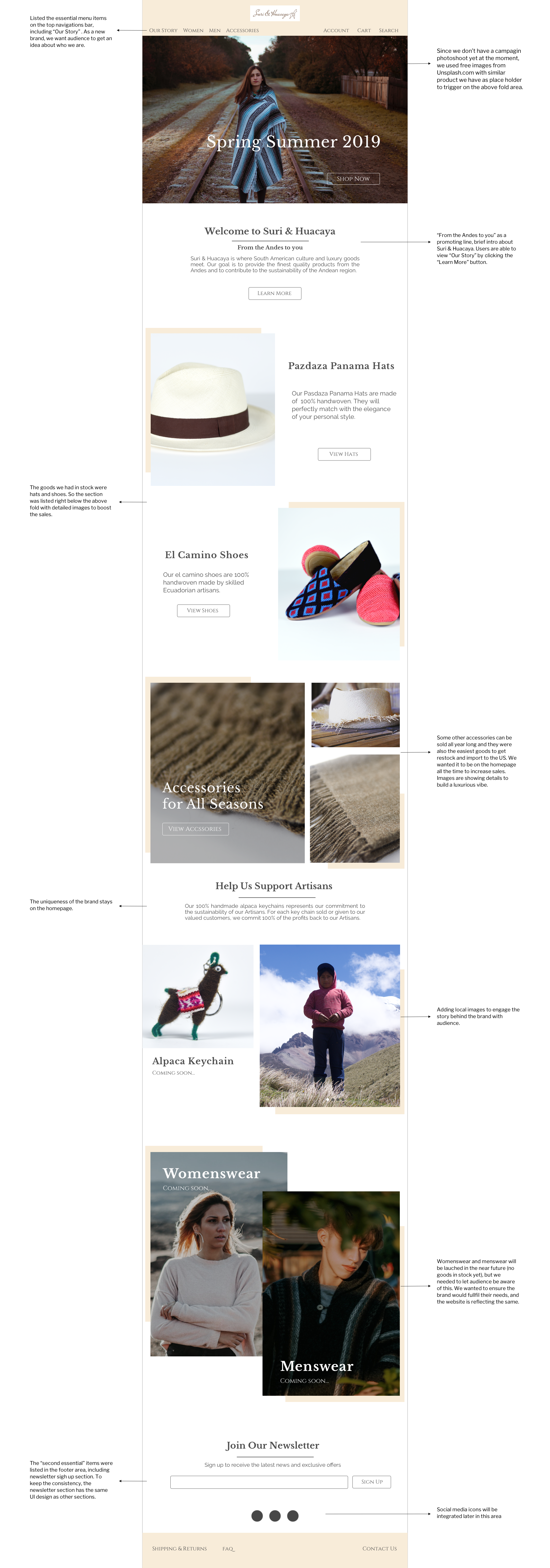 Suri & Huacaya is an e-commerce company that sells handmade luxury goods from South America. In May of 2019, I helped them with their homepage design.